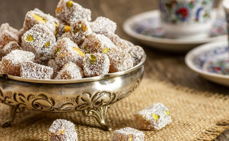 اگر به کشور ترکیه سفر کردید، حتما از راحت الحلقومهای خاص آن که با سرشیر تهیه شدهاند و روی آنها با پودر نارگیل تزئین شدهاند، استفاده کنید.