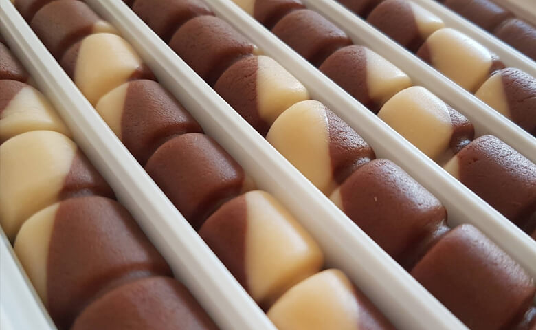 این شیرینیها مربعی شکل هستند و رنگی شبیه به قهوهای شیری دارند. دلیل این رنگ خاص، مواد تشکیل دهنده آن است.
